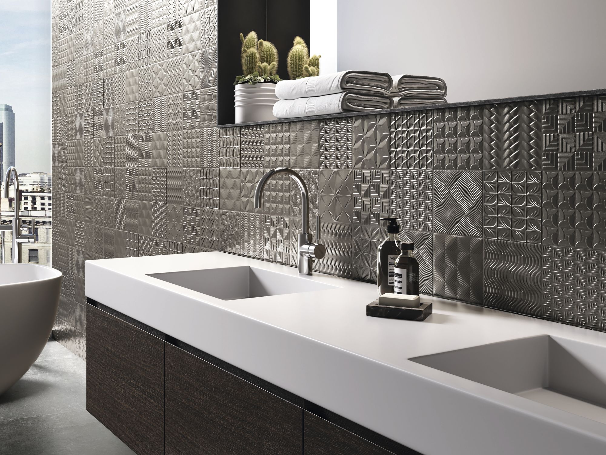 Otra de las tendencias del momento nos la trae Grespania con sus azulejos efecto textil, que también son perfectos para el cabecero de los dormitorios.